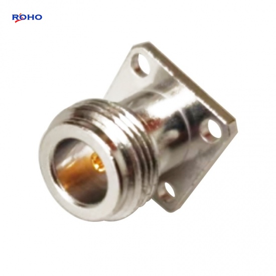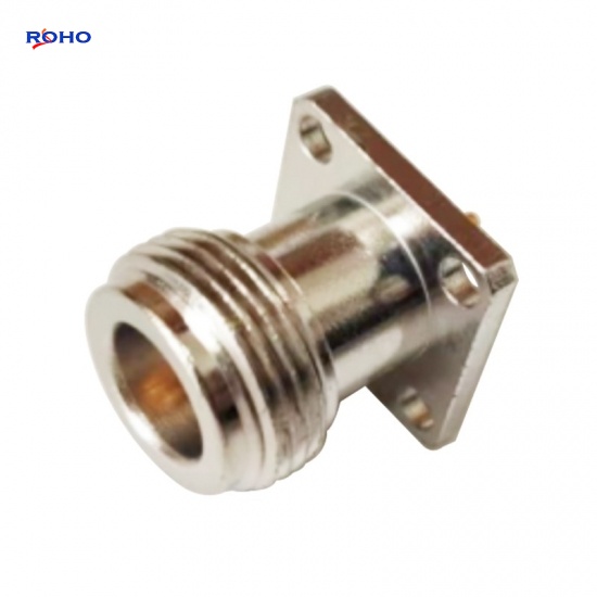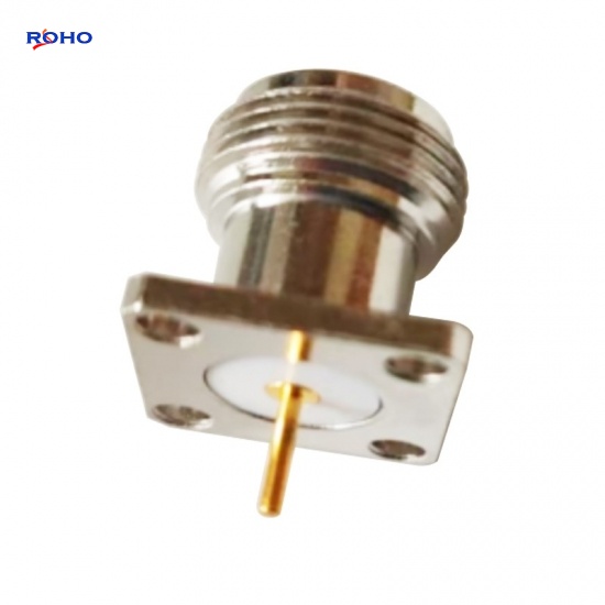 The N type connector are designed to satisfy the need for a durable, weatherproof, medium-size RF connector, frequency max up to 11GHz; this type N female terminal connector with 4 hole flange has an interface type of solder pin and a 50ohm impedance, attachment method uses shield/contact solder, its straight body is brass with nickel plating.